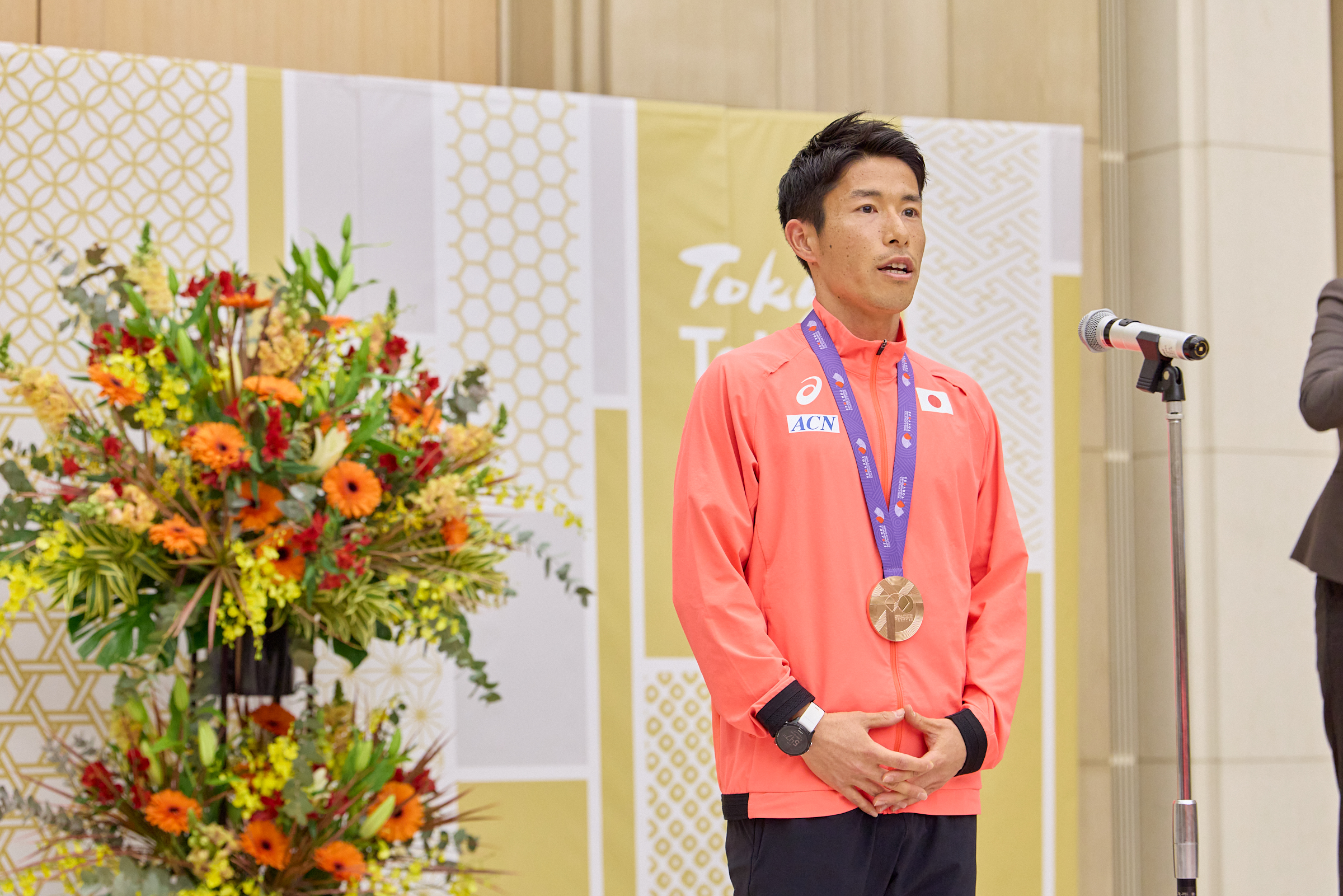 世界陸上にて日本唯一のメダルを獲得した競歩。勝木隼人選手は「この賞を受賞できたのは、東京都という素晴らしい場所で開催されたこと、都民をはじめとする多くの方々の後押し、そして支えがあったからだと思っています」と感謝の言葉を届けました。